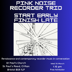 Pink Noise Recorder Trio present a concert of Renaissance and contemporary pieces for recorder ensemble, aiming to create a conversation between the centuries. The concert includes works by Binchois, Mellits and Mackerras.
